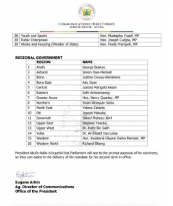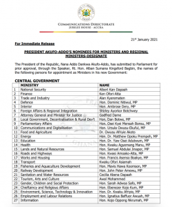 “In all, President Akufo-Addo will appoint a total of thirty (30) Ministers, and sixteen (16) Regional Ministers, bringing the total number of Ministers to forty-six (46). Eight (8) of this number are women – six (6) Ministers and two (2) Regional Ministers. This is the list that will be submitted to Parliament by the President on Thursday.”